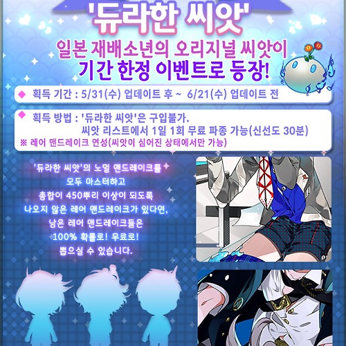 | [재배소년/업데이트] 기간한정 '듀라한 씨앗' 업데이트! (0) | 2017.05.31 |