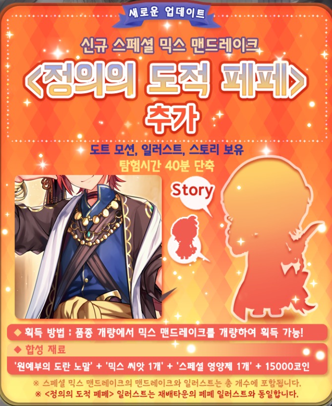 오랜만에 스믹맨 업뎃이네요! 정의의 도적 페페가 업데이트 되었습니다. 도트, 일러스트, 스토리와 함께 탐험시간이 40분 단축됩니다. 코인이 15000코인 밖에 안드네요! 코인 부담이 적어서 다행이네요...