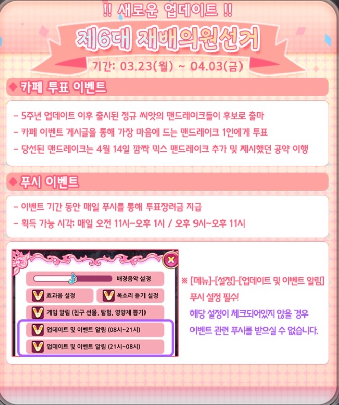 또, 푸시 이벤트도 나왔는데요. 4/3일 까지 이벤트 기간 동안 매일 푸시를 통해 다양한 보상을 받으실 수 있습니다. 설정에서 업데이트 및 이벤트 알림 켜놓으시면 놓치지 않고 받으실 수 있어요!