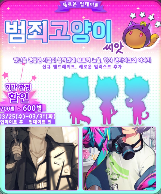 범죄고양이 씨앗은 3/31일 업뎃 전까지 600별에 할인 판매됩니다. 일러스트는 획득하는대로 올리도록 하겠습니다.