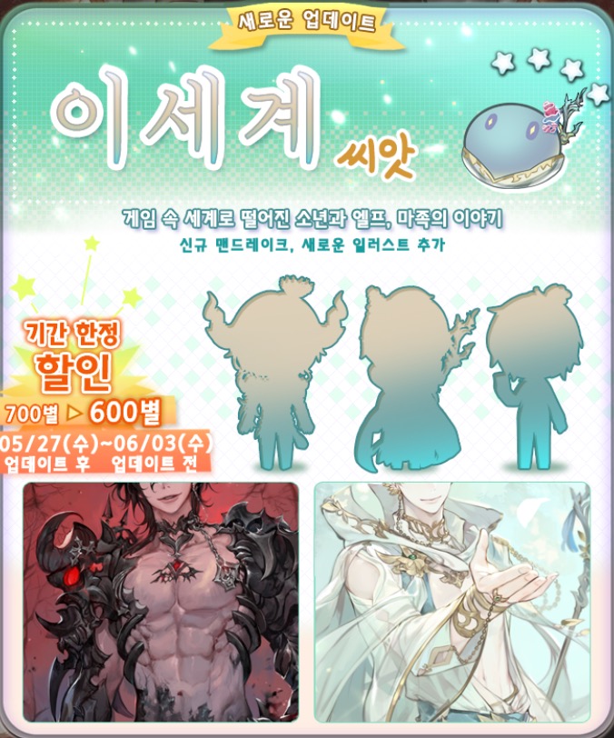 신규 4성 이세계 씨앗이 업뎃되었습니다! 6/3일 업뎃 전까지 600별에 할인 판매되네요. 게임 속에 떨어진 소년이 엘프도 만나고 마족도 만나게 되는 이세계물 스토리인데 일러퀄도 상당해서 기대가 됩니다.ㅎㅎ