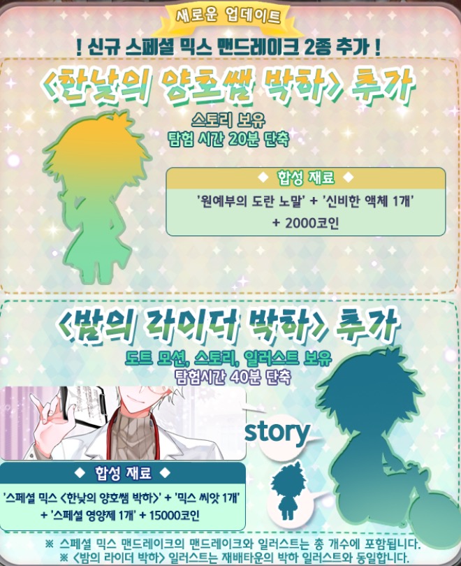 신규 스페셜 믹스 맨드레이크 2종 업뎃이 되었습니다! 둘다 박하쌤 믹맨으로 <한낯의 양호쌤 박하>, <밤의 라이더 박하> 밤낮으로 나뉘어져 있네요.ㅎㅎ 일러스트가 있긴 한데... 밤의 라이더 박하는 재배타운 박하 일러스트와 동일하다고 합니다.